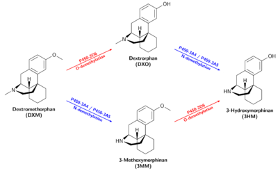 DXM is O-demethylated into Dextrorphan (DXO / D-3-hydroxy-N-methylmorphinan) by the CYP2D6 enzyme.[15][16] DXM is also N-demethylated into 3-methoxymorphinan (MEM / Morphinan) by the CYP3A4 enzyme[16][17] and to a lesser extent CYP3A5.[18]