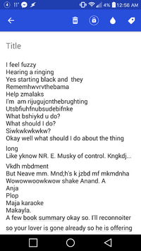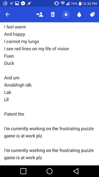 Behind closed eyes and within my "loud brain", I tripped out hardcore. I felt like I was spinning. My body tingled all over and I had a subtle sense of euphoria. My thought processes made absolutely no sense to me. I was on my phone and felt like I wasn't in control of my thumbs. For some reason, I opened up a notetaking app and started to type random phrases, letters, words, and just plain gibberish. A lot of the text I typed was from my keyboard's auto-correction/auto-prediction feature, but mostly I was trying to put down my unsober thoughts and make sense of what was happening in my mind. I stared at the screen and saw red lines running down my phone. I had this encompassing feeling of warmth and happiness.