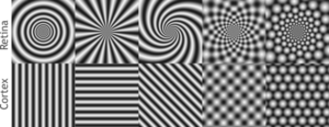 Retinal phosphenes are extant as a mathematical projection of the retina's cylindrical shape upon the neurological processing centers of the visual cortex, and thus often produce the tunnel-like properties or kaleidoscopic manifestations of phosphene organization; while relative cortical layouts produce the wave-like flickering and pulsing within the contrasting, delineated levels of flashing luminosity.[citation needed]