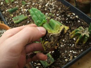 Like many other plants, Echinopsis pachanoi can be propagated from cuttings. The result is a genetic clone of the parent plant. For example, the top 15 cm end of a cactus column can be cut off with a clean and sterilized knife (It can be sterilized with ethanol or fire), then the cutting can be left to dry for about two weeks in the shade, or in a dry place. This is so that the surface of the cut end dries out like paper forming a seal to keep out microbes such as fungi and bacteria. The cutting can then be dipped in rooting hormone (optional, but effective) and planted on the surface of or buried to a maximum of 2.5 cm deep in good propagation media mixed with some sand and perlite. The sand and perlite will ensure that the media will drain and not stay too wet. The cutting is kept in the shade or indirect sunlight, so that the root system can develop and the cactus does not grow too thinly. It is best to withhold watering for first two week to encourage the root to grow. The moisture in the media alone is sufficient to begin the formation of adventitious roots. Lightly tug on the cactus to check for root formation. Do not attempt to pull the cactus all the way out of the soil to examine it. You will damage any roots that may have already begun to form. After about six months, significant roots will have formed and the cutting can be repotted in the same type of medium.