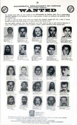 The Brotherhood of Eternal Love, (also known as the "Hippie Mafia" or BEL) was a religious/philosophical organization which initially started as a small commune, but by 1969 evolved to become the notorious "brotherhood" dedicated to the manufacture and widespread distribution of Orange Sunshine LSD at minimal profit, which they funded by simultaneously running the largest marijuana smuggling operation in the US. Much like the motive described in the legal defence written by Richard Kemp, British chemist convicted in the UK Operation Julie arrests, the BEL claimed to be driven their belief that "LSD, through the heightened perceptions and insights it produced, had the potential to radically alter the direction of the human race towards a better pathway for the future".