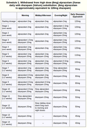 As an example of a slow withdrawal schedule, a user taking 40mg diazepam a day (or the equivalent) could reduce their daily dosage by 2mg every one or two weeks until a dosage of 20mg diazepam per day is reached; this would take 10 to 20 weeks. Starting from 20mg diazepam per day, reducing the amount to 1mg per day every week or two may be preferable, taking a total of 20 to 40 weeks.[5] Some users may prefer to reduce faster and some may go even slower.